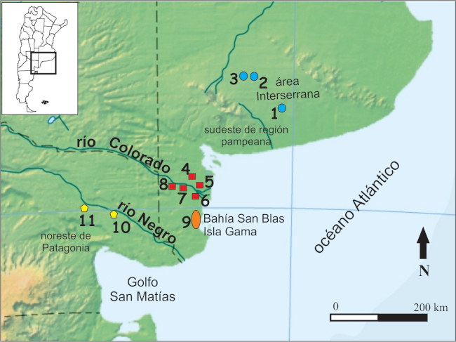 En el sudeste de la región pampeana, noreste de Patagonia y transición pampeano-patagónica oriental se identificaron numerosos sitios arqueológicos con entierros humanos correspondientes a grupos cazadores-recolectores. Dentro del conjunto de inhumaciones recuperadas se observaron diferencias en la cantidad, modalidad de entierro y tipo de depósito de los restos humanos, así como en el impacto de los agentes tafonómicos que perturbaron las inhumaciones y afectaron la preservación del tejido óseo y dental (Barrientos, Oliva y Del Papa, 2002; Flensborg, Bayala y Martínez, 2017; González, 2007, 2013; Kaufmann et al., 2019; Serna y Romano, 2018, entre otros). En algunos de estos casos se presentaron dificultades para estimar el sexo a través de la aplicación de métodos morfológicos y métricos en elementos óseos dimórficos como los coxales, el sacro, el cráneo y la mandíbula (Flensborg, Martínez y Bayala, 2015; Kaufmann et al., 2019). Por este motivo, y ante la escasez de antecedentes en Argentina (Luna, 2008), se desarrolló un método a partir del estudio de la métrica del cuello de los dientes permanentes de 21 individuos procedentes del curso inferior del río Colorado (provincia de Buenos Aires), correspondientes al Holoceno tardío (ca. 3000-250 años AP). Estos individuos contaban con información sexual estimada a partir de la aplicación de métodos bioarqueológicos convencionales (variables del coxal y del cráneo) (Luna y Flensborg, 2017). En ese trabajo no se analizaron las medidas de la corona debido al elevado grado de desgaste que presentaron las piezas dentales. En el método propuesto se estableció un punto de corte para discriminar entre sexos, a través del cálculo del promedio entre la medida más alta correspondiente a los individuos femeninos y la más baja de los masculinos, para cada variable. Los diámetros bucolinguales del cuello del canino superior y de ambos segundos molares permanentes, los dientes más dimórficos de la muestra, presentaron altas probabilidades de asignaciones correctas (mayores a 0,75). El dimorfismo sexual registrado fue elevado (9-15%) y se ubicó en el extremo superior de los valores correspondientes a diferentes poblaciones humanas (Acharya y Mainali, 2007; Garn, Lewis, Swindler y Kerewsky, 1967; Schwartz y Dean, 2005). No obstante, y de acuerdo con las variaciones mencionadas anteriormente respecto de la diversidad poblacional humana en el dimorfismo sexual, este método, creado para su aplicación en muestras dentales de un área específica, debe ser puesto a prueba cuando se incorporan al análisis restos bioarqueológicos procedentes de otras regiones (Fig. 1). En consecuencia, el objetivo de este trabajo es testear el método odontométrico propuesto por Luna y Flensborg (2017) y discutir su utilidad en contextos mortuorios de cazadores-recolectores del Holoceno tardío en una escala espacial mayor, que abarca el curso inferior del río Colorado, el curso medio del río Negro, San Blas-Isla Gama y el área Interserrana. Dado que las series esqueletales correspondientes a poblaciones prehispánicas que habitaron las regiones pampeana y patagónica generalmente presentan un marcado dimorfismo sexual, observado principalmente en variables discretas del coxal, se propone como hipótesis que dicho dimorfismo también debería reflejarse en la dentición, por lo que el método aquí aplicado permitiría estimar el sexo de los individuos en un elevado porcentaje.