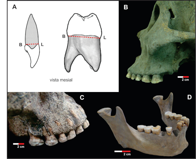 La metodología de análisis consistió en la medición del diámetro máximo bucolingual del cuello (unión cemento-esmalte; Kieser, 2008; Mayhall, 2000) de los caninos superiores y de ambos segundos molares (Fig. 2A) con un calibre odontométrico de puntas planas y elongadas marca Mitutoyo, Modelo 573-721. Se excluyeron los dientes con evidencias de caries, depósitos de cálculos dentales y defectos hipoplásicos a lo largo de la unión cemento-esmalte, que hubieran imposibilitado la toma adecuada de las medidas (Figs. 2B-2D). Además, la dentición de los individuos que pertenecen a grupos cazadores-recolectores suelen presentar un elevado desgaste dentario que alcanza la raíz, por lo tanto, la selección de la muestra para este trabajo estuvo condicionada por esta variable. De acuerdo a todo esto, la muestra analizada está compuesta por un total de 96 piezas dentales, representada en proporciones similares entre los tres tipos de dientes: 30 caninos superiores (CS), 35 segundos molares superiores (2MS) y 31 segundo molares inferiores (2MI).
