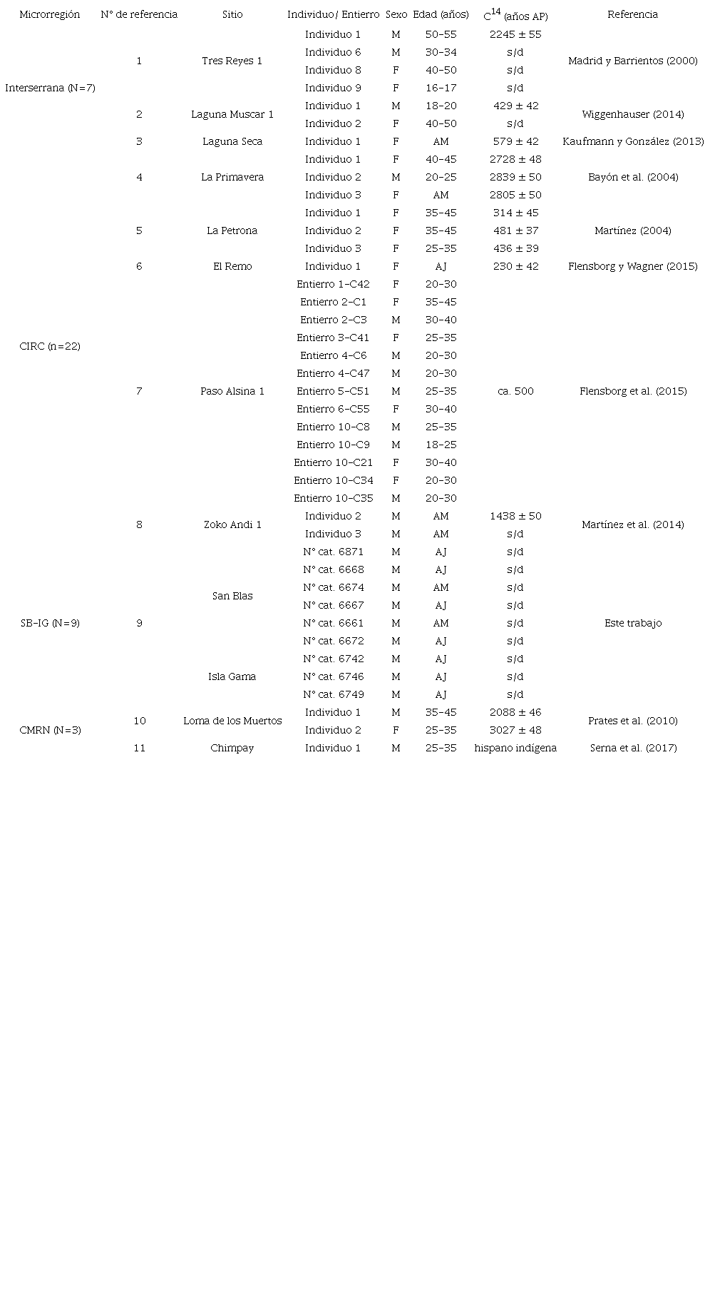La muestra está compuesta por 41 individuos (Tabla 1) que provienen de las microrregiones Interserrana (NMI=7), curso medio del río Negro (NMI=3), San Blas-Isla Gama (NMI=9) y curso inferior del río Colorado (NMI=22). En este último caso, la muestra está compuesta por individuos que fueron utilizados para el diseño del método (n=17) y otros nuevos que son incorporados en este trabajo (n=5). La serie esqueletal se encuentra alojada en el Instituto INCUAPA-CONICET, Facultad de Ciencias Sociales-UNICEN y en la División de Antropología del Museo de La Plata, Facultad de Ciencias Naturales y Museo, Universidad Nacional de La Plata. La muestra procedente del área Interserrana es asignable al lapso ca. 2200-400 años AP (Kaufmann y González, 2013; Madrid y Barrientos, 2000; Wiggenhauser, 2014) y está compuesta por tres individuos masculinos y cuatro femeninos correspondientes a cinco adultos y a dos juveniles. En el caso del curso medio del río Negro, la muestra pertenece al lapso ca. 3000 años AP-hispano indígena (Prates, Flensborg y Bayala, 2010; Serna, Prates y Luna, 2017) y está conformada por individuos adultos, dos masculinos y un femenino. La muestra seleccionada correspondiente a la zona de San Blas-Isla Gama no cuenta con fechados radiocarbónicos directos, sin embargo, dataciones de la colección indican un marco cronológico de ca. 1500-600 años AP (Bernal, González, Perez y Pucciarelli, 2008). La misma está representada por nueve individuos masculinos adultos. Por último, la muestra del curso inferior del río Colorado comprende una cronología de entre ca. 2800-200 años AP (Martínez, 2017) y está constituida por 10 masculinos y 12 femeninos adultos.