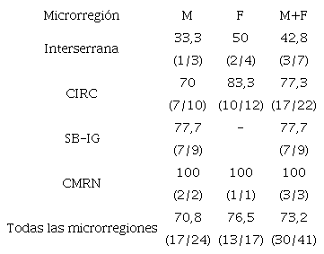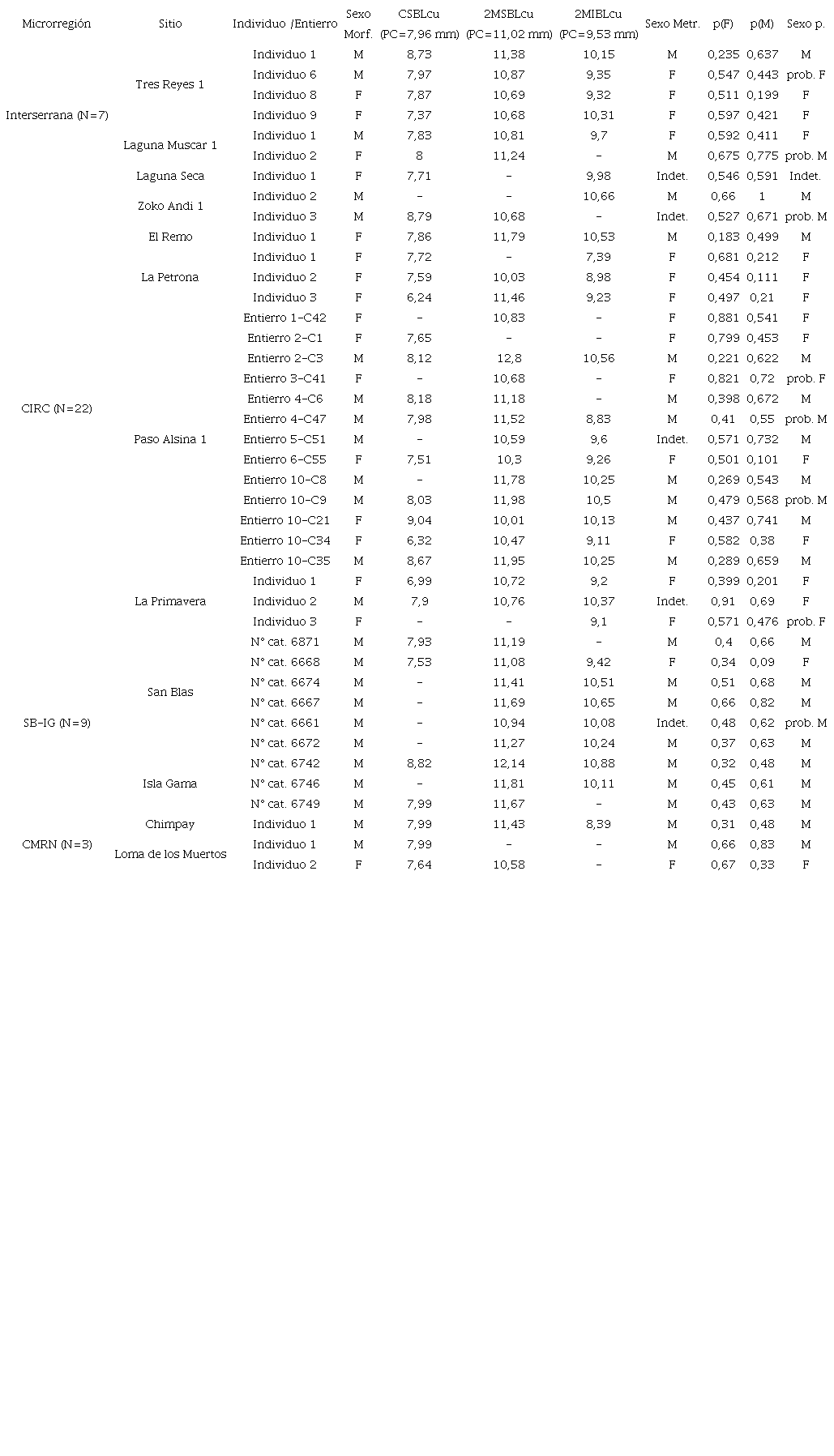 Teniendo en cuenta como unidad de análisis a la microrregión de procedencia de cada individuo, se observa que para los correspondientes al área Interserrana se obtuvo información sexual para el 85,7% de la muestra (6/7), mientras que el 14,3% (1/7) restante fue asignado como indeterminado (Tabla 2). Tanto al evaluar las medidas directas como las probabilidades, el porcentaje de coincidencia con los resultados generados desde los métodos tradicionales fue bajo (50%; 3/6), principalmente para el sexo masculino (33,3%; Tabla 4). Para el curso inferior del río Colorado se obtuvo información del sexo en 19 casos (86,3%), mientras que los tres individuos restantes fueron clasificados como indeterminados (13,7%). En 2 casos (10,5%) los resultados arrojaron estimaciones opuestas a las reportadas (Tabla 2). Si se tienen en cuenta las probabilidades, fue posible realizar la estimación sexual en el total de los individuos (n=22), 19 de ellas coincidentes con la asignación original (86,4%) (Tabla 2). Las estimaciones sexuales obtenidas desde la métrica dental coinciden con aquellas reportadas a partir de los métodos tradicionales, en mayor frecuencia para los femeninos que para los masculinos (Tabla 4). En el área de San Blas e Isla Gama, el análisis de las medidas directas permitió generar información acerca del sexo en el 88,8% de los individuos (8/9), mientras que el 11,2% restante fue estimado como indeterminado (Tabla 2). Esta muestra está constituida solo por individuos masculinos y el porcentaje de coincidencia de los resultados entre la métrica dental y los métodos morfoscópicos es elevado (87,5; 7/8; Tabla 4). Solo en un individuo (11,2%) se obtuvo una estimación opuesta a la reportada. Respecto de las probabilidades, los resultados son levemente superiores ya que se obtuvo información sexual para el total de la muestra y las asignaciones correctas fueron del 88,8% (8/9). Por último, en el curso medio del río Negro se obtuvo información sexual en el 100% de los individuos analizados, coincidiendo todos los resultados con aquellos reportados a partir del uso de métodos tradicionales (Tabla 4).