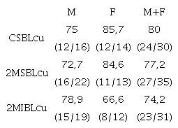 También se consideraron las probabilidades de asignaciones correctas -P (B|A)- para cada una de las medidas. Se calcularon las frecuencias de casos femeninos con respecto al total de individuos que presentaron valores menores a los obtenidos para cada una de las medidas, y lo opuesto para el caso de los masculinos. Este procedimiento permitió establecer las chances de que un individuo adicional ingresado a la muestra pertenezca a uno u otro sexo. Las probabilidades de asignación correcta para los puntos de corte son las siguientes: CSBLcu: p(M)=0,80, p(F)=0,77; 2MSBLcu: p(M)=0,85; p(F)=0,77; 2MIBLcu: p(M)=1, p(F)=0,88. Previamente al análisis de los datos obtenidos, se evaluó el error intraobservador para descartar la influencia de factores externos de medición utilizando el Coeficiente de Correlación Intraclase con el programa R 1.9.1. La concordancia entre dos mediciones obtenidas para cada variable, tomadas en forma independiente, fue alta en todos los casos (Luna, 2008).