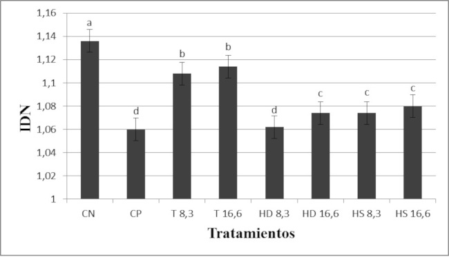 En lo que respecta a la proliferación celular (IDN), se encontraron diferencias estadísticamente significativas entre los grupos (F= 114,11 p=0,0) a través del ensayo de ANOVA Simple. A partir del análisis por contraste de múltiples rangos se observaron cuatro grupos: a. control negativo (CN); b. controles con vitamina E (T 8,3 y T 16,6); c. tratamientos semanales combinados con vitamina E (HS 8,3 y HS 16,6) y tratamiento diario con la dosis más alta de vitamina E (HS 16,6); d. tratamiento diario con la dosis más baja de vitamina E (HD 8,3) y control positivo (CP). De todos los tratamientos combinados, aquel con la suplementación semanal y la dosis más alta de vitamina E (HS 16,6), presentó el mayor IDN (Fig. 1). El control negativo, presentó el IDN más elevado y el control positivo con bleomicina los valores más bajos.