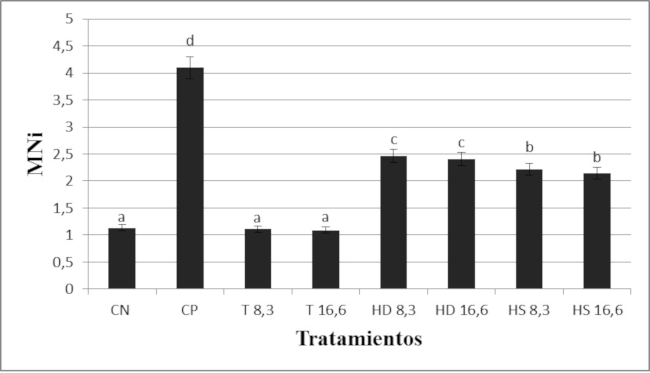 Los MNi, NPBs y NBuds se analizaron en 1.000 células binucleadas. El test de ANOVA Simple evidenció diferencias estadísticamente significativas (F= 840,04; p= 0,0) sólo para la frecuencia de MNi. Se diferenciaron 4 grupos: a. control negativo (CN) y ambos controles con vitamina E (T 8, 3 y T 16, 6); b. ambos tratamientos semanales (HS 8,3 y HS 16,6); c. ambos tratamientos diarios (HD 8,3 y HD 16, 6); d. control positivo (CP). Se observó un aumento significativo de micronúcleos en los tratamientos diarios respecto de los semanales (Fig. 2) y, además, se pudo observar menor frecuencia de daño cromosómico a mayor concentración de vitamina E, aunque estas observaciones no resultaron estadísticamente significativas. Los tratamientos con hierro diario tuvieron frecuencias mayores de MNi que los semanales.