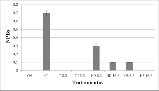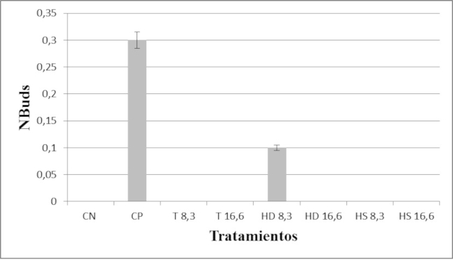 Cuando se analizaron las frecuencias de NPBs, las diferencias no resultaron estadísticamente significativas entre los tratamientos (F=2,54; p=0,107) (Fig. 3). Dado que las frecuencias de los NBuds no responden a una distribución paramétrica, se utilizó la prueba de Kruskal-Wallis (E=12,63; p=0,082). Dentro de la comparación de a pares, sólo resultaron estadísticamente significativas las diferencias entre el control positivo y los demás tratamientos (Fig. 4).