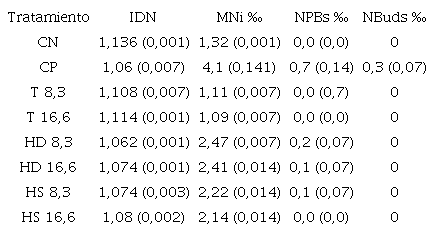 En la Tabla 1, se resumen las frecuencias de los cuatro biomarcadores analizados (IDN, MNi, NPBs y NBuds). En el caso del IDN, se observa que los valores de los controles se encuentran ligeramente por encima de los correspondientes a los tratamientos combinados. En el caso de la frecuencia de MNi, se puede observar como los tratamientos con hierro diario muestran valores más altos que aquellos con hierro semanal, y que aquellos con la concentración más elevada de vitamina E poseen menores frecuencias de esta alteración. En el caso de los NPBs y NBuds las frecuencias son bajas en todos los tratamientos, sin embargo, la tendencia se corresponde con los valores de referencia que propone Fenech, 2007.