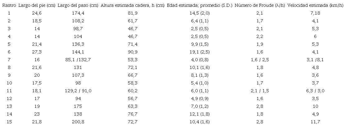 Para la estimación de la velocidad se utilizó la matriz de datos básica publicada como Tabla 1 (Bayón y Politis, 1996), la cual incluye valores del largo total de la huella y la longitud del interpaso, además de otras variables. El método de estimación, basado en la metodología de Alexander (1976, 1984) consistió en la aplicación de la relación empírica entre la velocidad adimensional (número de Froude) y la longitud del paso adimensional, según la ecuación: λ/h = a·(v2 / gh)b (1).