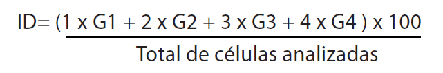 Cada una de las 200 células analizadas por punto experimental fueron clasificadas en 5 categorías: grado 0 (G0) células sin daño en el ADN, cola no visible; grado 1 (G1) células con daño leve en el ADN, pocos fragmentos en la cola; grado 2 (G2) células con daño intermedio, varios fragmentos en la cola del cometa; grado 3 (G3) células con daño severo, muchos fragmentos en la cola del cometa; grado 4 (G4) células con daño grave, casi la totalidad del ADN se encuentra formando su cola (Olive, 1999; Collins, 2004). A partir de esta clasificación se estableció para cada uno de los preparados un índice de daño genético (ID), según la siguiente fórmula (Collins, 2004).