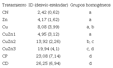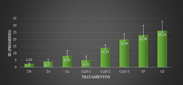 A través del método LSD de Fisher quedaron conformados 4 grupos homogéneos: a) CN, Zn, CuZn1 y Cu; b) Cu y CuZn2; c) CuZn2 y CuZn3; d) CuZn3, CP y CD. En este sentido, se observó que la combinación con la proporción más baja de Cu/Zn (CuZn1) presentó valores de ID similares a los de CN, Cu y Zn; y significativamente inferiores a los observados para las combinaciones CuZn2 y CuZn3. De esta manera, las combinaciones con las mayores proporciones Cu/Zn (CuZn2 y CuZn3) mostraron valores de ID significativamente aumentados respecto de CN, Zn, Cu y CuZn1. Es de remarcar que la combinación 3 (CuZn3) presentó valores de ID semejantes a los observados para CP y CD.