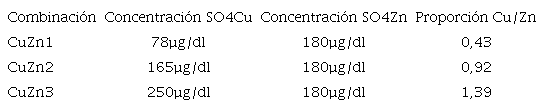 En la Tabla 1 se observan las concentraciones de SO4Cu y SO4Zn junto con las proporciones Cu/Zn para las tres combinaciones establecidas.