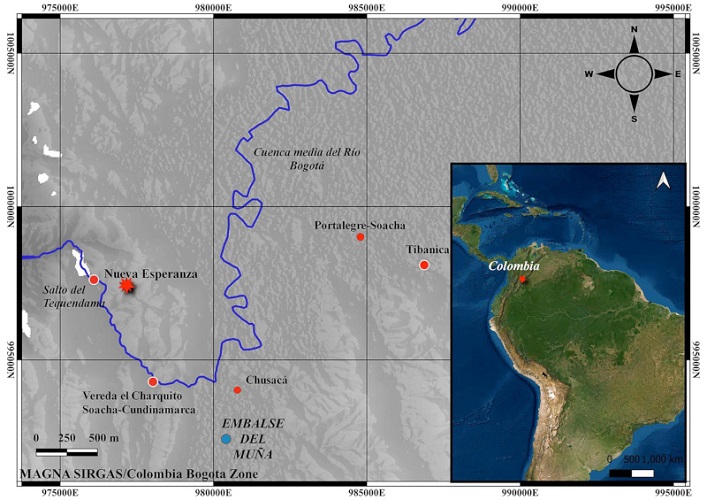 La población de estudio corresponde a una aldea agrícola prehispánica asentada en un aterrazamiento aluvial, cerca de la cuenca media del río Bogotá y a solo 1.100 m en línea recta del emblemático Salto del Tequendama, en el actual municipio de Soacha-Cundinamarca. El sitio arqueológico, conocido en el ámbito académico como Nueva Esperanza (Fig. 1), se encuentra a 2596 msnm en una zona de Bosque Seco Montano Bajo de Niebla; además, los paisajes del área circundante a la terraza son variados, pues incluyen lomeríos y fuertes pendientes de las vertientes cordilleranas (González-Larrota, 2017; Rivas-Estrada, 2021; Santa-Ríos, 2018).