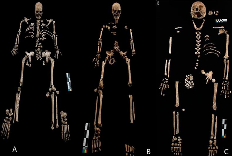 El segundo, identificado con el código E41/R17/T15/I1 (en adelante individuo 2) es una mujer con una estatura aproximada de 144 cm de acuerdo al cálculo que se realizó a partir del análisis de la tibia. Las estaturas de ambos individuos se encuentran dentro del promedio estimado para el Muisca temprano (Marulanda-Guaneme, 2020). El cuerpo del individuo 2 se encuentra casi completo; conserva cráneo, mandíbula, extremidades superiores e inferiores (con ausencia de algunos huesos de las manos y de los pies), unas pocas costillas y vértebras, mientras que los omoplatos y la clavícula izquierda están ausentes (Fig. 3B). Por su parte, el tercero de ellos, codificado como E42/R44/T23/I1 (en adelante individuo 3), corresponde a una mujer cuyo estado de preservación es regular. Conserva el cráneo, la mandíbula, las extremidades superiores e inferiores, las vértebras cervicales y fragmentos de costillas izquierdas, mientras que están ausentes algunos huesos del a mano y los omoplatos (Fig. 3C). Finalmente, el cuarto de ellos, el cual se encuentra asociado con el código TCE4/R128/T55/I77 (en adelante individuo 4), corresponde a un esqueleto de sexo masculino que se encontró casi completo, aunque en regular estado de preservación.