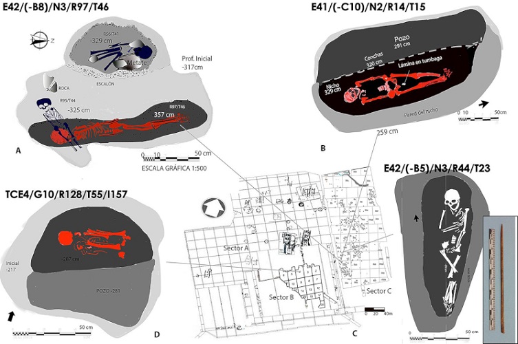 La segunda mujer (individuo 3) fue hallada en una fosa de forma rectangular con nicho lateral. Se trataba de un enterramiento individual, en posición decúbito dorsal extendido, con los brazos extendidos y las piernas cruzadas; además, como elementos mortuorios asociados presentaba una aguja labrada con hueso de animal, evidencia del modo de vida textil de esta población (Fig. 4C). Solo el individuo 1 formaba parte de un enterramiento colectivo, primario y directo; el cuerpo se encontraba acomodado en posición decúbito ventral extendido con los brazos extendidos y las piernas cruzadas. Un aspecto importante de su contexto mortuorio es el hecho de que en un estrato superior -y cruzando sus extremidades inferiores-, fue excavado un infante aproximadamente de tres años; además, frente a su fosa se encontró el enterramiento de una mujer cuya edad fue estimada entre los 30 y los 39 años (Fig. 4A). La forma del rasgo y las características del relleno permitieron inferir que estos tres individuos fueron inhumados de forma simultánea.