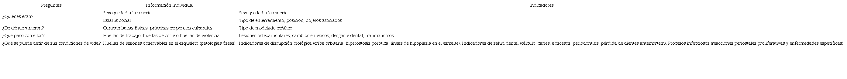Para las descripciones e interpretaciones de los cuatro casos se retomó el enfoque osteobiográfico propuesto inicialmente por Saul (1972) y posteriormente ampliado por Stodder y Palkovich (2012) a partir de lo que ellos denominan la Bioarqueología de los individuos. Desde esta perspectiva, se destaca la pertinencia de estudiar la agencia humana, con base en la experiencia vivida que está en consonancia con el curso de la vida en que se encontraban los individuos al momento de su muerte. De acuerdo con ello, las preguntas del modelo propuesto permiten realizar el análisis en contexto de experiencias tanto a nivel individual como colectivo, lo cual es pertinente para este estudio ya que las poblaciones están compuestas por sujetos que brindan una comprensión biocultural de condiciones y estilos de vida (Tabla 1). Se parte de admitir que a partir de la lectura empírica que ofrece un esqueleto es posible llegar a aproximaciones que dan cuenta de cuestiones sobre identidad, etnicidad, migración, cosmovisión, así como de historias de vida. Por tanto, este enfoque, además de indagar sobre aspectos relacionados con el nacimiento, la vida y la muerte, también explora los roles particulares que las personas desempeñaron en su sociedad (Stodder y Palkovich, 2012). De ahí que el uso combinado de fuentes históricas y etnohistóricas, arqueológicas y osteológicas, han hecho posible expandir la escala analítica e interpretativa de la bioarqueología al superar el paradigma descriptivo. Estos enfoques contemporáneos han hecho posible que los individuos ya no se analicen de manera aislada, lo cual a su vez ha permitido fortalecer la naturaleza creativa e interdisciplinaria de la bioarqueología.