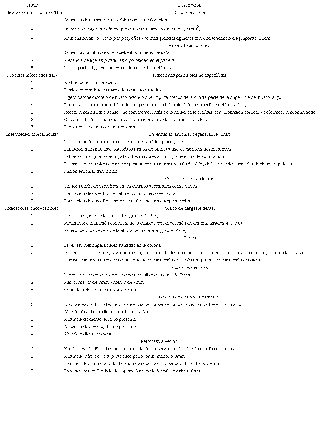 Los bioindicadores óseos y dentales que se utilizaron para evaluar disrupción biológica fueron: indicadores nutricionales (no específicos), desgaste dental, caries, enfermedad periodontal, pérdida de dientes antemortem, reacciones periostales (no específicas), enfermedad articular degenerativa en miembros superiores e inferiores y osteofitosis en vértebras (Brothwell, 1987; Smith, 1984; Steckel et al., 2018; Vega y Cucina, 2011) (Tabla 2). Para la descripción de patologías específicas y diagnóstico diferencial se abordó a Isidro y Malgosa (2003) y a Ortner (2003). Finalmente, para el análisis de la modificación cefálica, se utilizó la clasificación propuesta por Tiesler (2012), en la cual se evalúa el tipo, la variante y el grado.