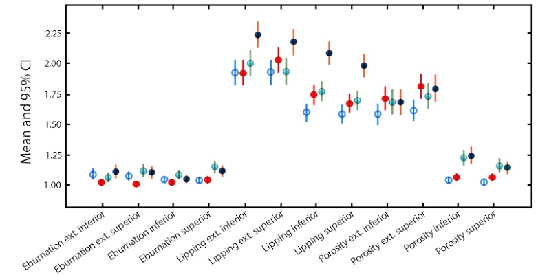 When the 95% confidence intervals are compared across age and sex categories, notable differences include the distinctly higher marginal lipping and extent of marginal lipping scores for elderly males. Older adult males are relatively elevated in extent of porosity for both inferior and superior surfaces compared to other age/sex categories although the elderly of both sexes surpass older adults in porosity. For extent of eburnation inferiorly, older adult females and elderly males are distinct from older adult males, while superiorly, all age/sex categories are elevated compared to older adult males. The elderly, and particularly females, surpass older adults of both sexes in scores for eburnation superiorly (Fig. 4).