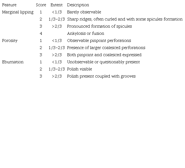 Lipping, porosity and eburnation signal osteoarthritis but reflect the various responses of the body to the narrowing or obliteration of interior joint spaces (Robson-Brown et al., 2008; Zehra et al., 2015). The scoring system used here preserves the independence of each degenerative marker. Although none of them specifically, such as eburnation, or in combination are used to diagnosis osteoarthritis, all of these degenerative markers are involved in the expression of this pathology.