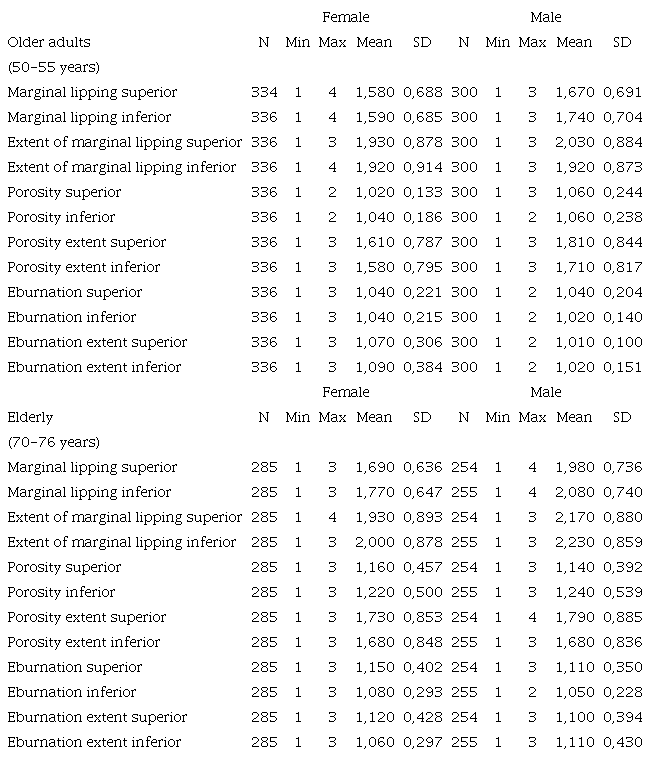 Older adult males have higher or equal means than their female counterparts for all features excepting eburnation and extent of eburnation where females show greater or equal values (Table 3). Similarly, the means for elderly males are higher than those of elderly females with the exception of porosity, eburnation and extent of eburnation where the converse is present (Table 3). In fact, the means for elderly males surpass those of all other age and sex groups with the exception of porosity, eburnation and extent of eburnation where elderly females are higher (Fig. 4). The means for lipping and extent of lipping are higher than for porosity and eburnation (Fig. 4). The standard deviation is highest for extent of marginal lipping across age and sex categories (Table 3).