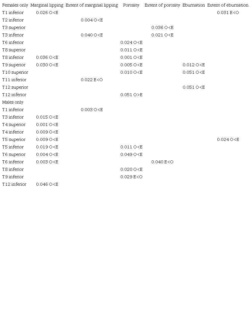 Males exhibit significantly greater severity of marginal lipping compared to females for inferior T1, T8 and T10 as well as superior T1 and T3 (Table 5). The same pattern holds for extent of marginal lipping for inferior T2 and T3 as well as for porosity on superior T1, and extent of porosity in superior and inferior T3 (Table 5). In contrast, females show a nearly significantly greater extent of eburnation compared to males for T12 superior (p=0.052).