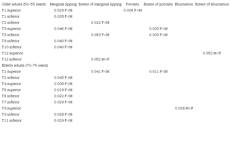 Elderly males are by far the most distinctive from their older adult counterparts in marginal lipping, where both superior and inferior surfaces of T4, T5 and T6, as well as inferior T3 and T12 are significantly different (Table 4). Elderly males compared to older male adults are also elevated in the severity of porosity where superior T6 and inferior T5, T8 and T9 differ significantly. In contrast, older male adults show greater severity of porosity in inferior T9 (p=0.029) as well as in the extent of porosity for inferior T6 (p=0.040). The elderly differ far more from older adults in the inferior vertebrae surfaces compared to the superior ones for both sexes, although the difference is more pronounced in males.