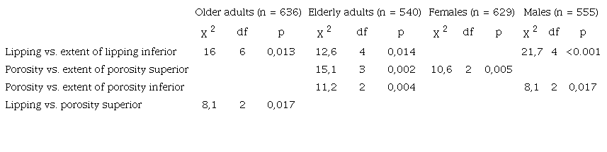 Most of the comparisons between degenerative joint changes are not significant. However, the degenerative markers that do demonstrate statistical significance are instructive (Table 6). Marginal lipping versus extent of marginal lipping on the inferior surface is significantly related in older adults (p=0.013), elderly individuals (p=0.014) and males (p=<0.001). In addition, porosity and extent of porosity on the superior surface are significantly associated in elderly adults (p=0.002) as well as females (p=0.005). Additional comparisons demonstrate significance (Table 6). One of these is porosity and extent of porosity on the inferior surface in elderly adults (p=0.004) and in males (p=0.017). Another is marginal lipping and porosity on the superior surface in older adults (p=0.017). Eburnation is not significantly associated with any of the other variables, including extent of eburnation, suggesting an independent expression of this degenerative marker.