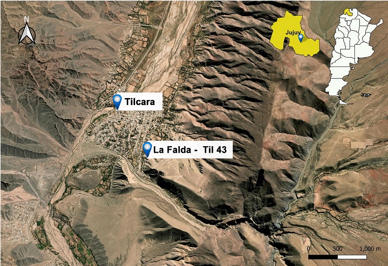El sitio La Falda es un área con entierros humanos localizada en el tramo medio de la quebrada de Humahuaca, en la actual localidad de Tilcara (Jujuy) (Fig. 1). Se trata de un cementerio caracterizado por la presencia de estructuras funerarias conformadas por un pozo vertical y una cámara lateral (Mendonça et al. 1997). Fechados radiocarbónicos efectuados sobre hueso ubican al sitio entre los años 1460 y 1639 cal AD (Beta- 153720=380±40BP; Beta-153721=370±40BP) (Arrieta et al., 2018). Estos fechados, junto con el hallazgo de elementos de origen europeo en el interior de las tumbas, confirman la pertenencia de este sitio al período Hispano-Indígena inicial (1536-1600/1700AD), un momento del desarrollo de las sociedades del noroeste argentino (NOA) en el cual se evidencia tanto la influencia cultural incaica como también los primeros indicios del contacto con los europeos (Bordach et al., 1998; Arrieta et al., 2018). Sin embargo, Mendonça et al. (1997) sugieren que los conquistadores europeos todavía no habían efectivizado la colonización de estos territorios en el momento que se formó este sitio.