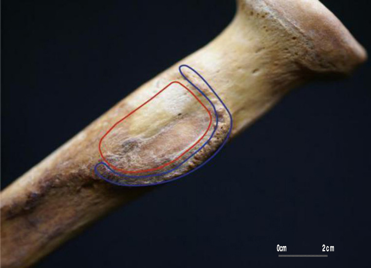 Para el relevamiento y registro de los CE se empleó el Nuevo Método Coimbra (Henderson et al., 2016, 2017), el cual se aplica únicamente en EFC. Este método divide a las entesis en dos zonas: la zona 1, la cual representa el margen de la entesis, en donde las fibras musculares se insertan al hueso más oblicuamente (i.e.; el margen más fibroso), y la zona 2, la cual abarca la impresión fibrocartilaginosa y la margen de la entesis restante (Henderson et al., 2016, 2017) (Fig. 2). En total el método considera seis rasgos. Sin embargo, dos de ellos, formación ósea y erosión, son relevados en las zonas 1 y 2 (FOZ1, ERZ1, FOZ2 y ERZ2, respectivamente). Los cuatro rasgos restantes (cambio textural (CT), porosidad fina (POF), macroporosidad (MPO) y cavitación (CAV)) son relevados únicamente en la zona 2. Todos los rasgos, excepto CT, se registran con tres grados de expresión (0, 1 y 2). Para CT solamente se considera ausencia (0) o presencia (1). En este estudio se analizaron 17 EFC correspondientes tanto a miembros superiores como inferiores (Tabla 2). El relevamiento de los CE se realizó a ojo desnudo (i.e.; sin la utilización de lupas) y bajo luz natural, con intermedios de descanso para evitar la fatiga visual, tal como fuera recomendado por sus autores (Henderson et al., 2016).