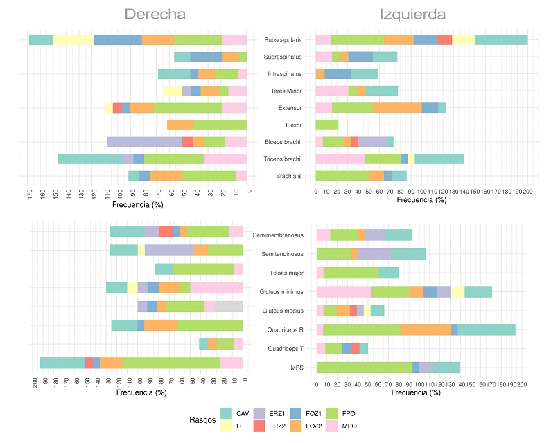 Con respecto a los grados se severidad de cada uno de los CE considerados, tanto para entesis de miembros superiores como inferiores, el grado 0 (i.e.; sin cambios) fue el más frecuentemente registrado, con una amplia diferencia respecto a los otros grados (ver Tablas Suplementarias 1 y 2). Es notable que algunos rasgos presentaron muy pocos cambios para la gran mayoría de las entesis, como fue el caso de CT. También es destacable que CAV registró muy pocos casos con cambios para entesis de miembros inferiores en general. Por otro lado, FOZ1 fue uno de los rasgos que más frecuentemente presentó cambios, registrando las mayores prevalencias de grados de severidad 2. Sin embargo, no fue posible visualizar una tendencia en cuanto a los cambios y a los grados de severidad ya que, como se mencionó en el apartado anterior, algunos CE se registraron mayormente en determinadas entesis, como por ejemplo ERZ1 en suraspinatus derechos, CT en biceps brachii, triceps brachii derechos y semitendinosus, MPO en triceps brachii, gluteus minimus y quadriceps (inserción en la tibia) izquierdos, y CAV en subscapularis.