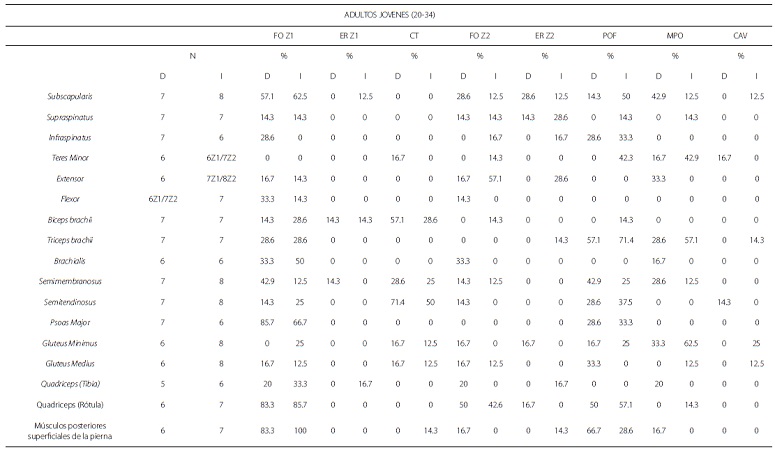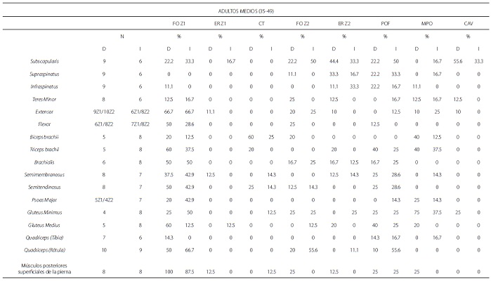 En cuanto a la variable edad, se observó que la misma tuvo un mayor efecto en la expresión de MPO en subscapularis y CT en semimembranosus en adultos jóvenes. Por otro lado, la presencia del cambio FOZ1 fue significativa en extensor y en la inserción de los músculos posteriores superficiales de la pierna en adultos medios (Tabla 8).