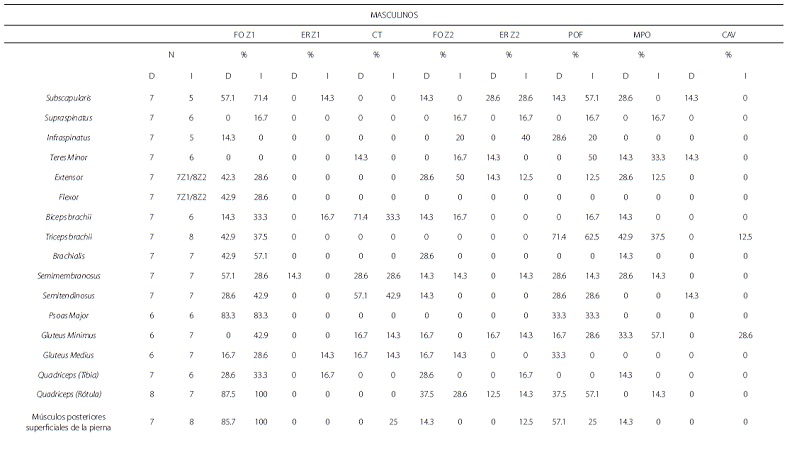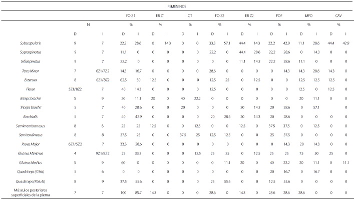 Respecto a la variable sexo, la misma resultó significativa en la expresión de FOZ2 en subscapularis y ERZ2 en supraspinatus en femeninos, mientras que FOZ1 tuvo mayor efecto en la inserción de los músculos posteriores superficiales de la pierna en masculinos (Tabla 8).