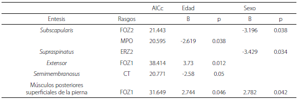 Se consideró la existencia de diferencias estadísticamente significativas cuando el valor de p fue ≤0.05. Además de los valores de p, que indican si una variable explicativa tiene un efecto significativo sobre los CE, también se incluyeron parámetros del modelo (valores B). Este parámetro indica la fuerza de asociación y su dirección entre la variable explicativa y la variable de respuesta. Por ejemplo, cuando se evalúa el efecto de la lateralidad sobre los cambios en las entesis, un valor B negativo significa que entesis derechas presentaron mayor frecuencia de CE que las izquierdas, y viceversa si es positivo. En cuanto a la edad y el sexo, un valor B negativo indica que los CE registrados en adultos jóvenes y femeninos poseen un mayor efecto que aquellos registrados en adultos medios y masculinos, y viceversa si B es positivo. También se consideró la medida de criterio de información de Akaike corregido para muestras finitas (AICc). Este valor representa la calidad relativa de los modelos estadísticos planteados, proporcionando un medio para la selección del mejor modelo. A menor valor de AICc obtenido, mejor es considerado el modelo. No se plantearon modelos de interacción entre los factores lateralidad, edad y sexo debido a las condiciones de la muestra (los adultos jóvenes estaban representados por una amplia mayoría de masculinos mientras que los adultos medios eran casi exclusivamente femeninos).