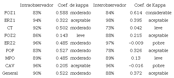 En cuanto al error interobservador, se obtuvo un porcentaje de acuerdo general de 88% (Tabla 3). Este resultado pone de manifiesto un elevado valor de acuerdo entre ambos observadores. Sin embargo, el grado de concordancia resultó aceptable. Los porcentajes de acuerdo, según cada una de las variables, se encontraron entre el 73% y el 98%. ERZ1, ERZ2 y CAV presentaron los porcentajes de acuerdo más elevados, mientras que los porcentajes de acuerdo más bajos se observaron en CT y POF. Es destacable que el grado de concordancia para ERZ2 y CAV resultó ser pobre, con valores de coeficiente kappa de Cohen negativos.