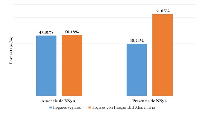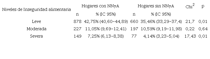 El análisis de los niveles de inseguridad alimentaria (leve, moderado y severo) evidenció que, tanto en los hogares con y sin NNyA, la inseguridad alimentaria leve fue la forma más prevalente, seguida de la moderada y la severa. La prevalencia de todos los niveles de inseguridad alimentaria fue mayor en los hogares con presencia de NNyA, con diferencias estadísticamente significativas para la inseguridad alimentaria leve y severa (Tabla 1).