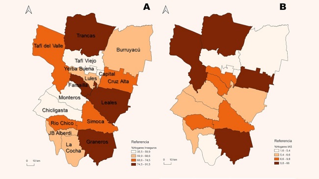 La Figura 2 presenta la distribución departamental de la inseguridad alimentaria. Se destacan los departamentos Graneros, Famaillá, Leales y Trancas por evidenciar prevalencias de HI por encima del 74,49% (Fig. 2A), mientras que Graneros, Cruz Alta, Trancas y Tafí del Valle presentaron las más altas de HIAS, superando el 9,79% (Fig. 2B).