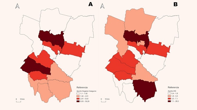 Respecto a la intensidad de la inseguridad alimentaria a nivel departamental, la Figura 3A evidencia que San Miguel de Tucumán, Tafí Viejo, Yerba Buena y Chicligasta constituyeron las áreas con mayor número de HI respecto del total reportado en la provincia. Mientras que, al indagar el aporte de HIAS, se destacaron los departamentos San Miguel de Tucumán, Graneros y Tafí Viejo (Fig. 3B).