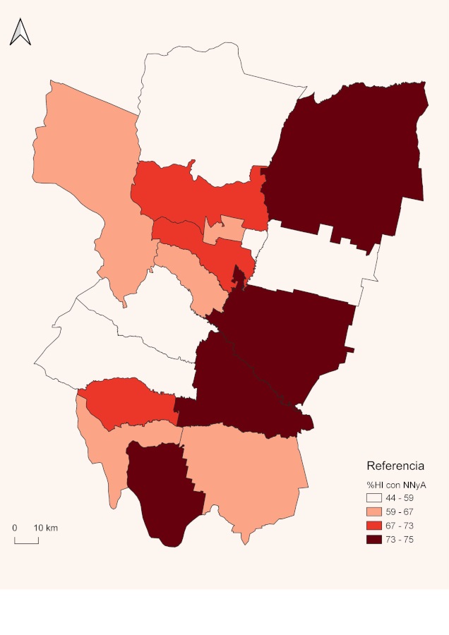 Los resultados obtenidos en el presente trabajo profundizan los informados previamente para el territorio tucumano (Cordero y Cesani, 2021) ya que dan cuenta de la magnitud y distribución territorial de la inseguridad alimentaria en el hogar a nivel departamental. Asimismo, evidencian la mayor vulnerabilidad de los NNyA ya que se encontró que los hogares donde residían menores presentaron una brecha de 22 puntos porcentuales de inseguridad alimentaria respecto de los hogares seguros. Estos resultados cobran especial importancia en una provincia como Tucumán, en donde los NNyA representan un tercio de la población y sobre dicho total, uno de cada cuatro menores se encuentra afectado por la pobreza (INDEC, 2010).