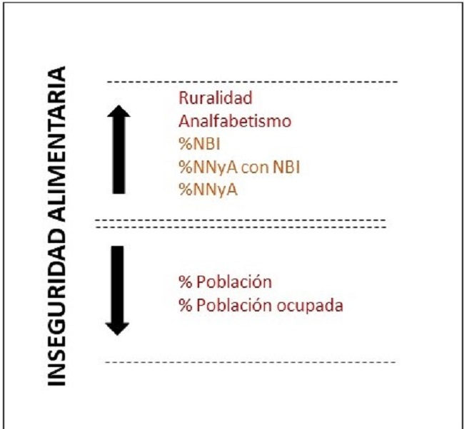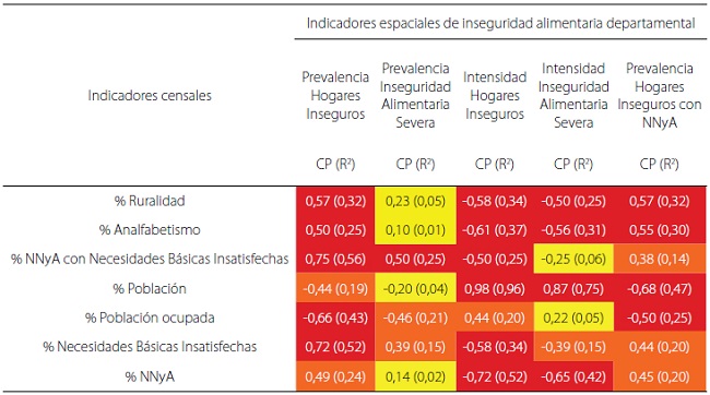 Por otra parte, para cada departamento se determinó el coeficiente de correlación de Pearson entre los indicadores espaciales de inseguridad alimentaria desarrollados y los siguientes indicadores censales (Instituto Nacional de Estadística y Censos, 2010): Porcentaje de ruralidad, Porcentaje de analfabetismo, Porcentaje de NNyA, Porcentaje de Población con Necesidades Básicas Insatisfechas (NBI), Porcentaje de NNyA con NBI; Porcentaje de Población, Porcentaje de Población ocupada (todas las personas de 10 años o más de edad que al menos durante una semana trabajaron al menos una hora). Este análisis permitió identificar: dirección (directa o inversa), intensidad (débil: 0,10-0,29; moderada: 0,30-0,49 y fuerte: 0,50-1,00) y el valor de R2 para cada correlación.