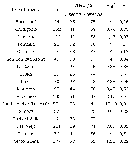 Se calcularon prevalencias departamentales de hogares con seguridad alimentaria (HS), hogares con inseguridad alimentaria (HI) y hogares con inseguridad alimentaria severa (HIAS). Asimismo, se efectuaron comparaciones entre hogares con presencia o sin presencia de NNyA. Para ello se determinaron prevalencias e intervalos de confianza al 95% (IC 95%) de hogares seguros e inseguros, así como también de los niveles de inseguridad alimentaria (leve, moderada y severa). Los análisis estadísticos se realizaron a nivel provincial y departamental aplicando pruebas de chi cuadrado (chi2) y la prueba exacta de Fischer (nivel de significación de p<0,05).