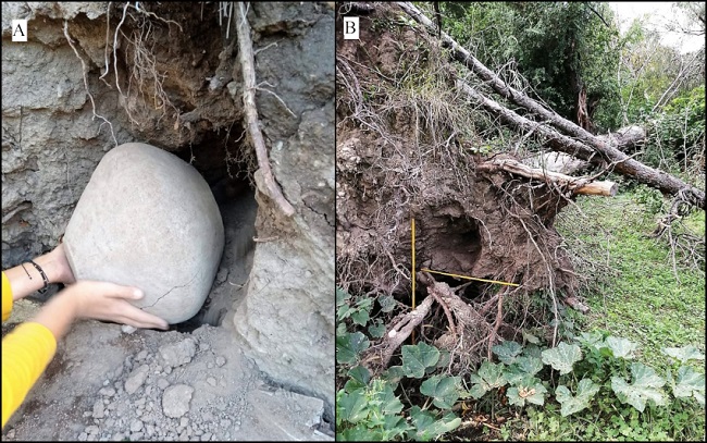 Esta vasija fue hallada en una propiedad privada de la localidad de La Población, -Departamento San Javier, Córdoba- (Fig. 1), que había quedado expuesta debido a las fuertes lluvias durante el verano de 2020. Por información brindada por la familia que hizo el hallazgo sabemos de la presencia de otros restos arqueológicos similares encontrados en el mismo terreno. Hacia fines de los años 1960, o inicio de 1970, se encontró otra vasija que posiblemente fue trasladada a lo que actualmente es el Museo de Antropología, Facultad de Filosofía y Humanidades, Universidad Nacional de Córdoba. Se iniciaron las búsquedas tanto documentales como de los materiales, pero hasta el momento no se ha podido ubicar entre las colecciones de este museo.
