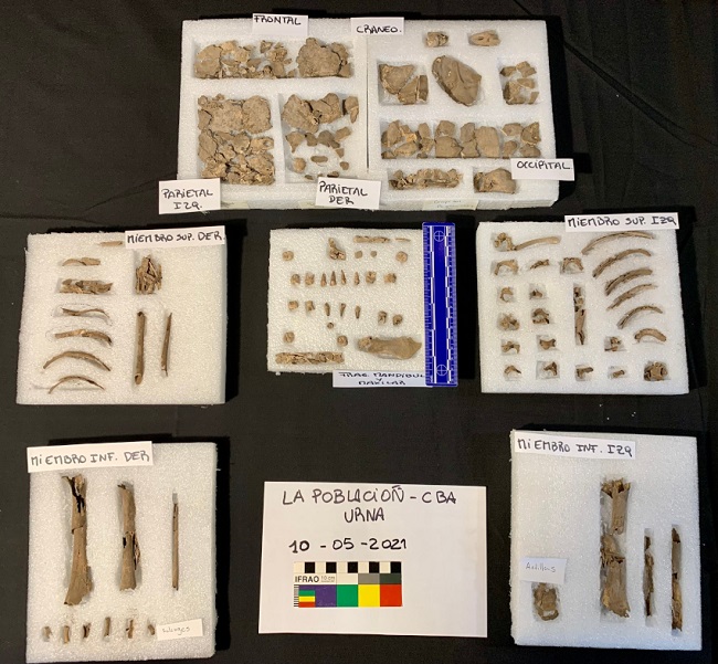Al respecto de los restos humanos encontrados en la vasija, se procedió con la limpieza mecánica de estos con herramientas aptas para minimizar el daño sobre los restos. Los restos óseos humanos se encontraban en muy mal estado de conservación en particular por el accionar de raíces que afectaron el cráneo y la mandíbula. Debido a su fragilidad se confeccionaron siete bandejas de espuma de propileno (Fig. 3). En cada bandeja se coloraron las piezas ubicadas anatómicamente, es decir miembro superior derecho, miembro superior izquierdo, miembros inferiores derecho, miembro inferior izquierdo y vértebras, en otras bandejas fue depositado el cráneo -en tres bandejas en donde se colocaron fragmentos de hueso del frontal y parietal derecho e izquierdo, occipital y luego fragmentos de maxilar y mandíbula con las piezas dentales recuperadas (Tabla 1). Los restos fueron colocados en una caja de cartón, forrada con espuma de polipropileno para evitar fricción mecánica que pudiera dañarlos.