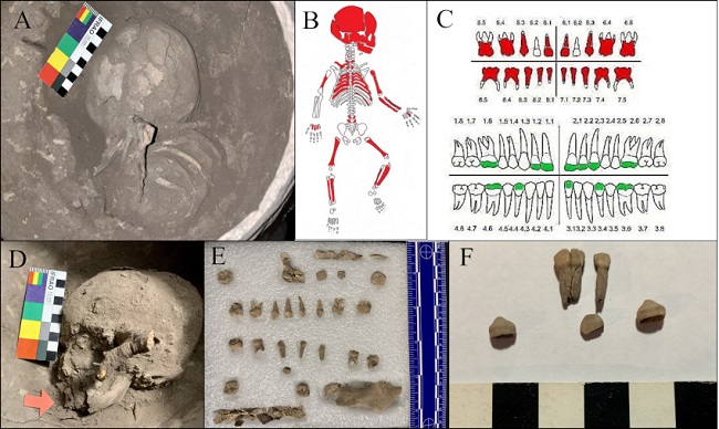 La mayoría de las piezas dentales deciduas se encontraron presentes al momento de la exhumación, a excepción de los incisivos centrales y un lateral inferior junto a los gérmenes de dos caninos y un incisivo también inferiores (Fig. 4C, D y E) que fueron recuperados luego de tamizar los sedimentos. Se recuperaron in situ también los gérmenes de las cuatro coronas pertenecientes a los primeros molares permanentes. La mandíbula izquierda se encuentra muy dañada debido a la raíz que la atravesaba, la hemimaxila derecha se encontraba en mejor estado de preservación. Al momento de analizar las piezas dentales encontramos que los incisivos centrales inferiores se encuentran unidos o fusionados (Fig. 4F), una anomalía dentaria muy difícil de registrar en restos arqueológicos, debido a diversos factores (Benazzi et al., 2010).