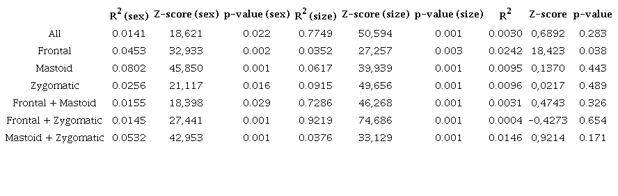 The variables sex and size showed a statistically significant association with the landmark coordinate data of the three traits separately and as a whole, without a significant interaction among these variables (Table 1). Depending on the variable used, accuracy and precision of sex estimation were higher when the shape variable was included in the analysis than when it was not (Table 2), and the successful classification tended to be more accurate in males than in females for both variables (i.e., LDA for shape and size components). Additionally, the phenotypic traits showing the high expression of dimorphic signal were frontal, and zygomatic bones, followed by the mastoid process (Table 2). Regarding accuracy and precision of centroid size, the mastoid process showed the highest values for both estimates.