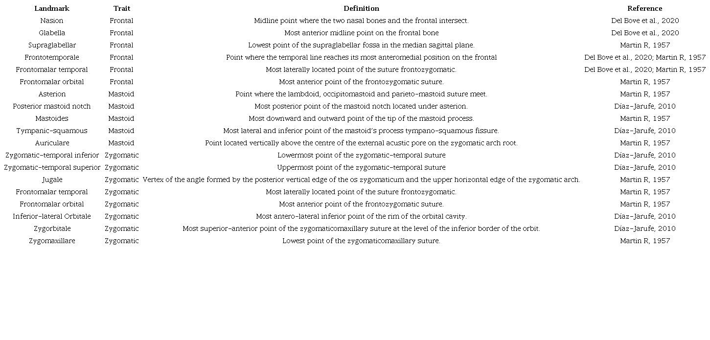 For this study, the lower portion of the frontal bone (i.e., glabella and supra orbital ridge) was used because the glabella and the supra orbital ridge are the most used sexually dimorphic traits within the frontal bone (del Bove et al., 2020; Walker, 2008). Considering this fact, it was recorded by 28 semilandmarks. The mastoid process and zygomatic bone were defined by 29 and 25 semilandmarks, respectively (Fig. 1).