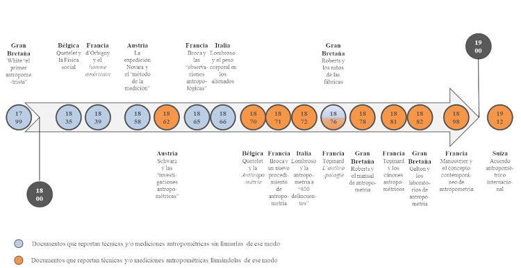 Línea de tiempo de publicaciones científicas europeas que contuvieron técnicas o datos antropométricos durante el siglo XIX.