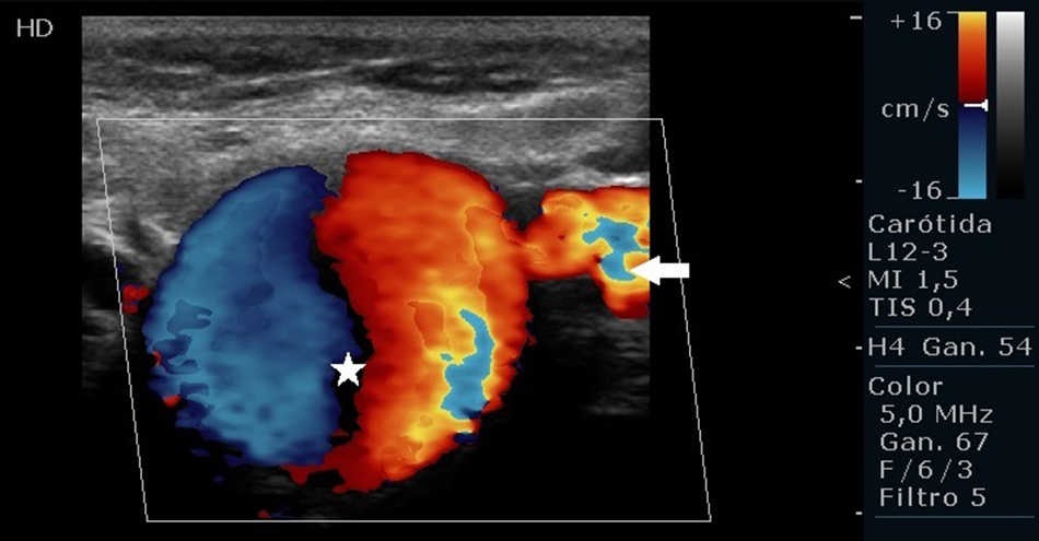 El diagnóstico se basa en datos clínicos y métodos radiológicos, como la ecografía Doppler, útil para determinar el tamaño y la extensión del aneurisma8. Esta lo muestra como una estructura quística anecoica, aunque es preciso emplear el análisis espectral y en color para detectar el flujo en patrón de ida y vuelta (signo del yin yang)9. De todos modos, el diagnóstico con esta técnica puede fallar si la lesión está en un punto muy alto, especialmente cuando el paciente tiene el cuello corto, o en la distinción entre un aneurisma verdadero y un pseudoaneurisma8.