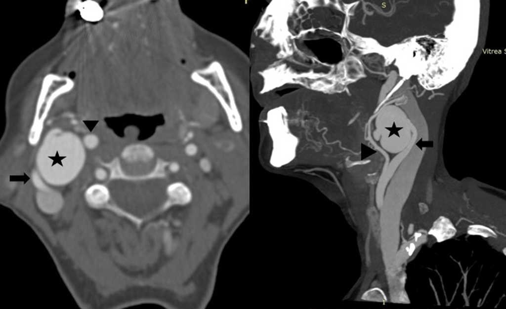 Los aneurismas de las arterias carótidas extracraneales son raros. Tienen una etiología variada y sus causas más habituales son la degeneración ateromatosa (40% de los casos) y los traumatismos (pseudoaneurismas)1. La bibliografía menciona enfermedades congénitas de la pared arterial, como la displasia fibromuscular (DFM) que afecta a menos del 1% de la población y ocasiona aneurismas congénitos, ataques isquémicos transitorios, infarto cerebral o hemorragia subaracnoidea2,3.