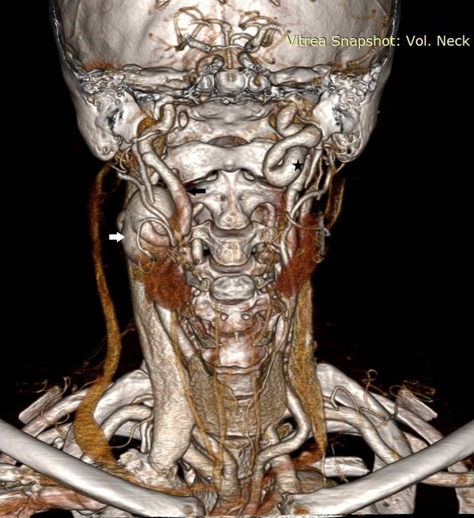 La ecografía Doppler de los vasos del cuello reveló una dilatación aneurismática sacular gigante de la arteria carótida interna (ACI) derecha. Con el mapa color y espectral se observó un flujo con patrón en ida y vuelta (signo del yin y yang), aunque no se pudo establecer si era un aneurisma o un pseudoaneurisma (fig. 1). No obstante, en la angiografía por tomografía computada multicorte (angio-TCMC) se identificó un aneurisma gigante sacular de la ACI derecha distal, de 33 × 22 mm, sin trombos murales (figs. 2 y 3). La ACI distal contralateral presentó un aspecto tortuoso y arrosariado, que alternaba entre zonas de estenosis y dilataciones fusiformes, sugerentes de DFM.
