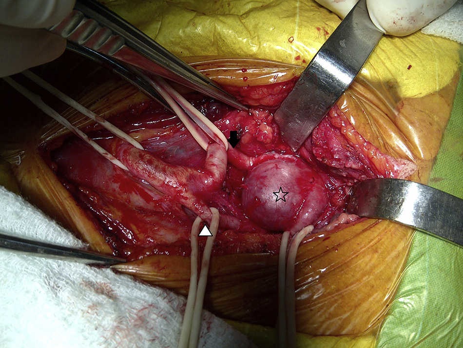 Se implementó un tratamiento quirúrgico de resección del aneurisma y reconstrucción mediante anastomosis término-terminal (fig. 4). La paciente en nuestro servicio solo recibió atención ambulatoria por la masa pulsátil y no se estudiaron las arterias renales.
