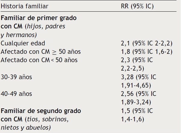 El riesgo familiar a desarrollar CM puede ser calculado de forma empírica, utilizando la información clínica familiar y la magnitud de riesgo en relación con los antecedentes familiares. Este ha sido evaluado en distintos estudios5–9 (tabla 1).