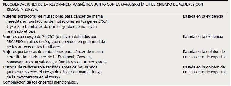 En mujeres con alto riesgo de cáncer de mama (≥ 20-25%), la resonancia magnética con contraste endovenoso es en la actualidad el método de cribado recomendado, junto con la mamografía, siendo el algoritmo más conveniente en la práctica la mamografía y luego la resonancia.