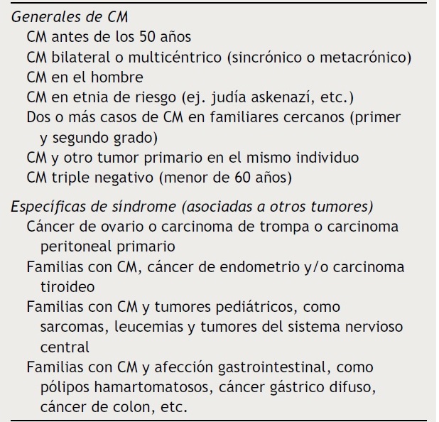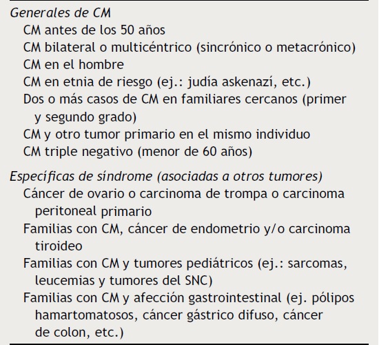 Además de las características relacionadas con el CM, existen otras pautas de sospecha particulares que dependen del síndrome involucrado y que es necesario tener en cuenta para la evaluación de riesgo de los pacientes.